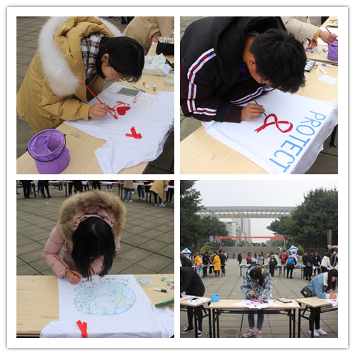 合川区疾病预防控制中心艾防科杨科长针对目前防艾情况的开展了讲话,她说到目前大学生的防艾意识还很薄弱,艾滋病的感染者比例比较大,大学生应该从被动了解防艾到主动学习防艾,让更多人成为艾滋病防控的宣传员。杨科长简短的话语结束后,活动正式开始参赛人员们摩拳擦掌,以百分之百的热情积极的投入到了比赛当中,这些来自各个专业的同学们,毫无保留地将自己的想法描绘在面前的白T恤上,底稿,构线,上色,各个步骤都在有条不紊地进行着,关于艾滋病的主题也在时间的流逝中一步一步体现了出来。现场的观众也是关注着选手们的传作过程,并在必要的时候给予帮助,在参赛者和观众们的互动中,爱的气氛正在不断升温,大家手中的代表着关爱艾滋病的红色丝带也散发着耀眼的光芒。
