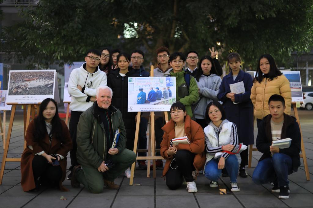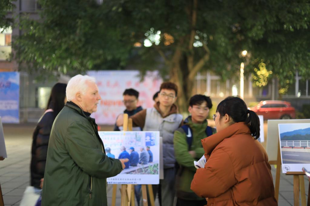 本次摄影展的作者多是2018级的同学们,发现,寻找,贵在真实。火锅店老板(重庆人的感情就在这一锅红火里了)、老鞋匠(足不出户却走遍天下)、装修工人(世间繁华,离不开你的一双巧手)、货车司机(为小家生计奔波四方,为国家发展贡献青春)……或许语言的不通会让人与人之间的交流产生隔阂,但是相片里的那一脉脉情意却可以让彼此走进对方心里面去。影展广场上迎来了一位特别的欣赏者——外教Rainer。爱莲书院的干事陈沿庆同学在一旁为其介绍,解决了语言交流问题。外教Rainer细心地欣赏了所有的摄影作品,并向交流人员表达了对作品的喜爱——富有生活气息以及真实感,很温馨。在被问及对中国的看法时,他谈到:中国拥有博大精深、源远流长的文化他要去学习;中国拥有许多不同的美食他要去品尝,感恩自己当初做出的中国之行的选择。同时他也是一名摄影爱好者,他认为即使是语言不通,但照片也可以传递拍摄者的思想和观点。就像人与人之间的沟通一样,可以从面部表情去感受。