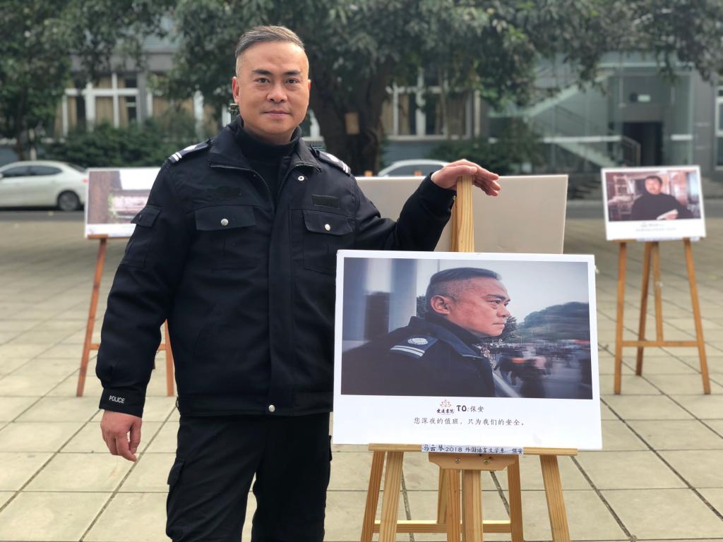 你们用生命为我们护航,我们用行动为你们喝彩。我相信学校保卫人员是我们永远的守护者。此次摄影作品中有一张保卫人员工作时的相片,双眸明亮,凝视远方,站岗执勤,校园安全,铭记于心。今天在广场上有幸的看见这位保卫人员,他与自己被定格的相片合影,那一刻他的心应该是激动的。感恩不仅仅只是我们需要为别人做什么,有时一句话的激励,一个动作的鼓励,甚至一张照片的印记,都是一种感恩,是对别人的一种肯定。