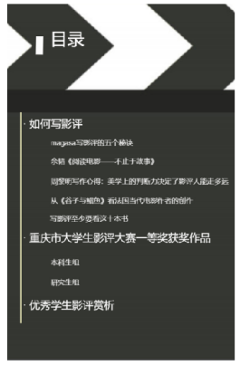 微信关注电影协会微信公众号:“重庆市大学生影评大赛”,了解和参与更多电影讯息和活动。