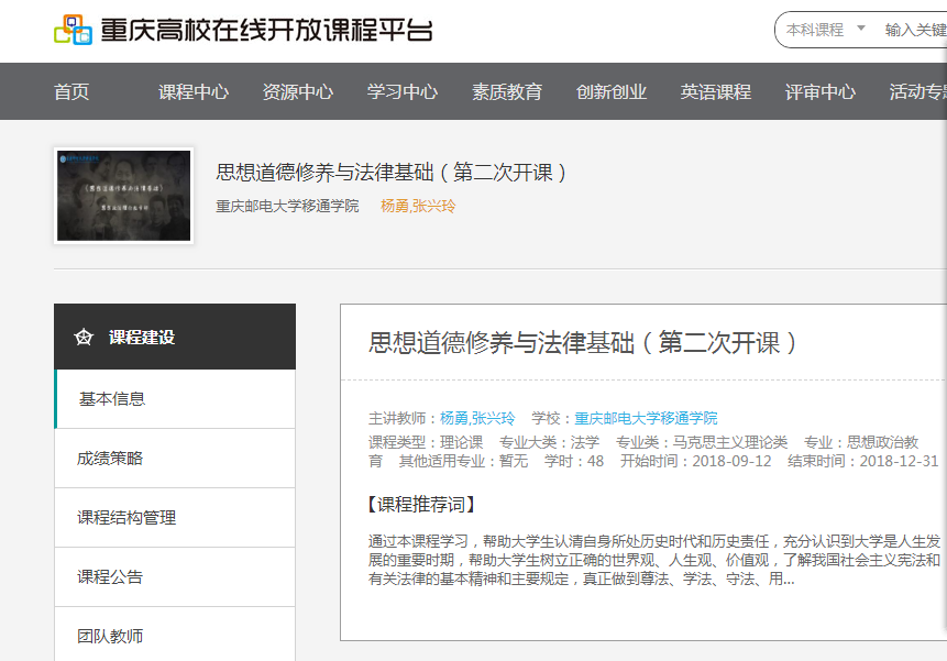 “改革只有进行时,没有完成时”。教育部陈宝生部长在新时代全国高等学校本科教育工作会议上提到“互联网+教育”正在成为世界各国争夺下一轮高等教育改革发展主导权、话语权的重要阵地和焦点领域。为落实国家相关的本科教育政策,推动思政课教学同信息技术高度融合,探索思政课教学模式的改革创新,增强课程教学的时代感和吸引力,我校思政教学部依托重庆市在线开放课程《思想道德修养与法律基础》进行翻转课堂的教学实践。