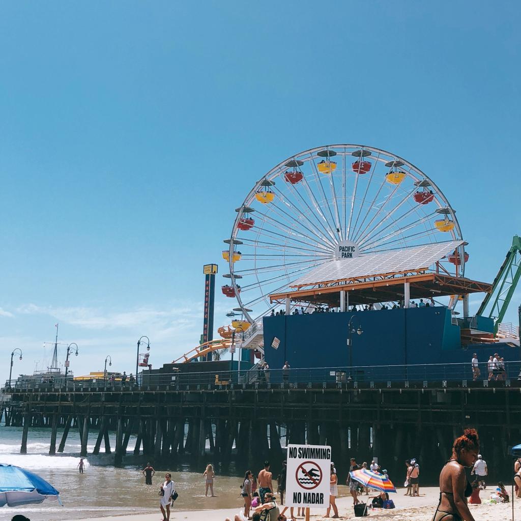 加州阳光,怎么少得了海滩细沙。大西洋沿线的加州有一系列迷人的海滩,在旧金山体会了一天感受四季之后,洛杉矶的阳光沙滩真的最迷人,最能代表加州。悠闲地在比弗利区逛完决定在日落前前往西海岸线上最长的面积最大的沙滩—-SantaMonica.冲着它的知名度,这里应该是第一次来洛杉矶首选的沙滩,因此不论什么时间段游客都众多,一眼望去成片的人躺在沙滩上裸晒、在海水里嬉戏,也有许多像我一样穿着便装只能在海岸边感受一下海浪拍打在脚上的清凉感。这里有长长的海岸线,海滩的起点就是它著名的标志——沙滩乐园,一个建在沙滩和海上的游乐园。挂满霓虹灯的摩天轮和过山车是santa monica标志性的建筑,为其增添了娱乐欢快的气氛。在Santa monica旁有一条非常经典的骑行线路,路上都有许多明显标志,许多人选择在周末前来,伴随着紫红色的夕阳和湿润凉爽的海风骑行,欣赏沿路的美景。海岸实在太长,逛了三分之一的路程便决定买些吃的,然后躺在沙滩上等待日落,追随着夕阳的脚步,我看到了世间最美的日落。这一切都惬意又美好。