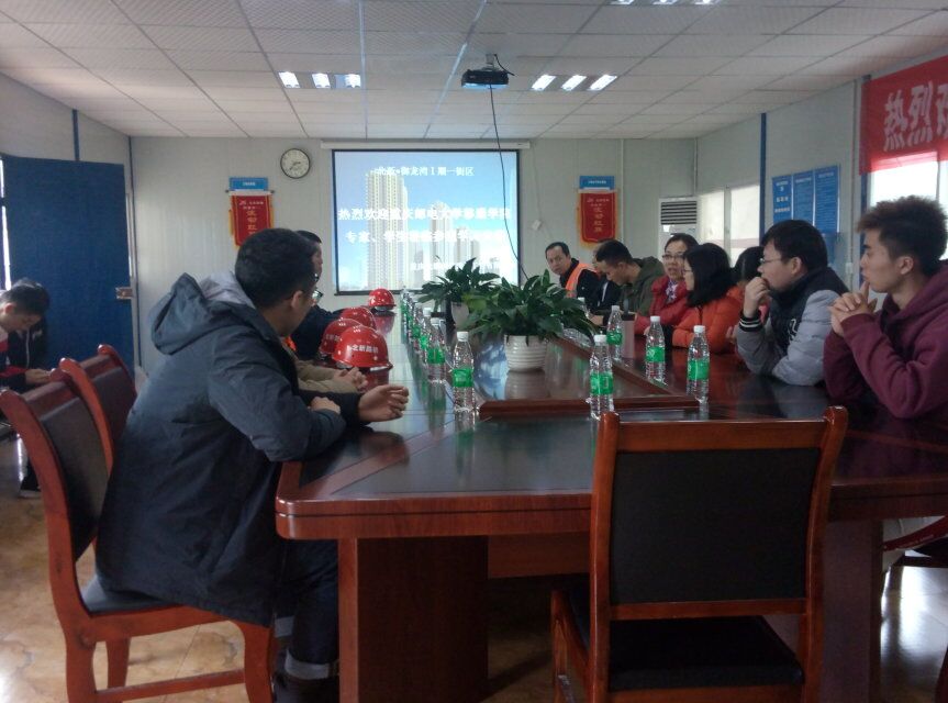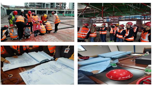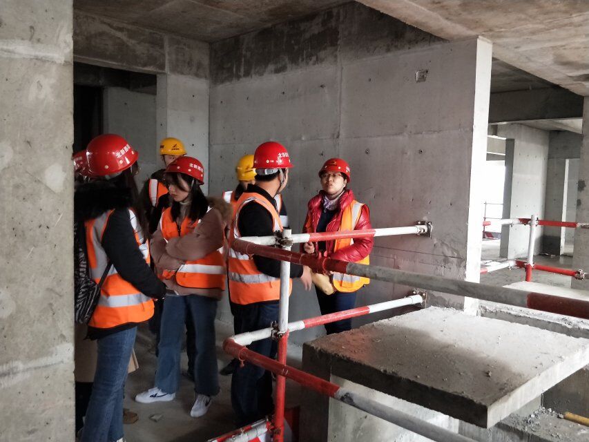 针对同学们提出的相关问题,黄工、吉工、智工和周总等一一进行了详细的解答。经过深入地学习后,同学们对包括企业结构、成本控制、安全保障、质量监测、合同签订等问题有了更加清晰明了的认识。随后我校师生在现场管理人员带领下,分成两个小组,严格按照正规入场程序,有序地佩戴好安全帽,穿上醒目的工地人员专用安全防护马甲,在安全工程师引导下进入工地现场进行学习观摩。