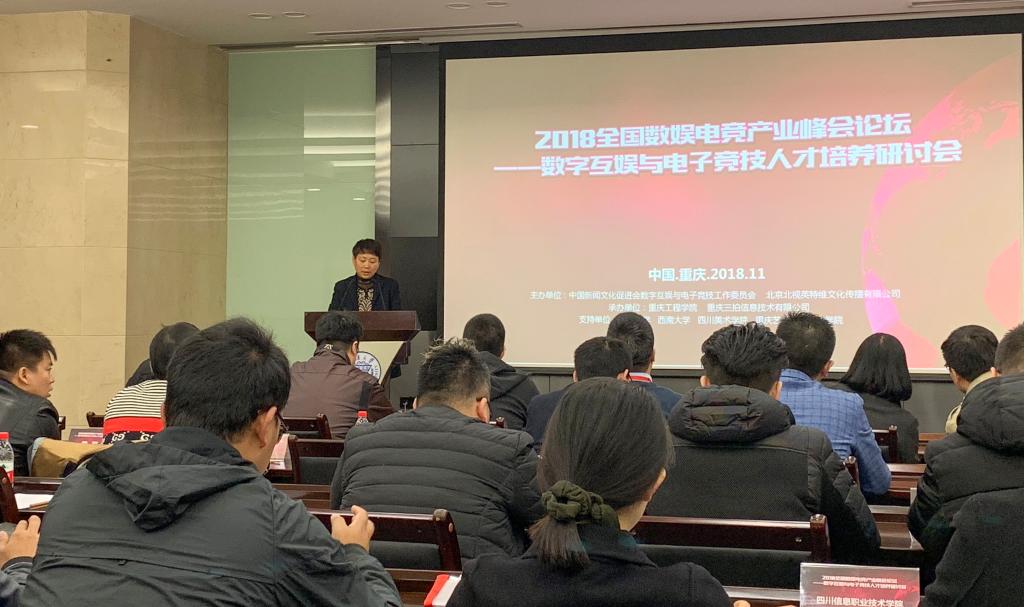 近日,由中国新闻文化促进会数字互娱与电子竞技工作委员会和北京北视英特维文化传播有限公司主办的“2018全国数娱电竞产业峰会论坛——数字互娱与电子竞技人才培养研讨会”在重庆大学召开。本次会议由重庆工程学院与重庆三拍信息技术有限公司承办,同时邀请到重庆大学、四川美术学院、西南大学、重庆艺术工程职业学院等高职院校代表教师参加。动画教研室主任黎珂位、教学优秀团队负责人王芳带队参加了此次研讨会。
