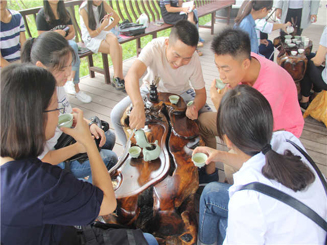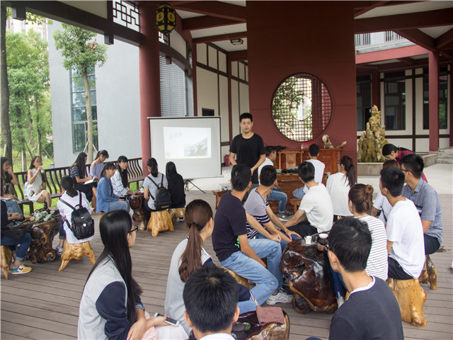 茶学社里弥漫着宁静的空气,即便是有人交谈你也不会觉得吵闹。我坐在亭子四周的木椅上,听着社长为我们讲解茶文化,用社长的话来说,茶作为中国一大国粹,宗旨就是“和”。中国是茶的起源地,品茶的历史源远流长。茶文化自然也是博大精深。