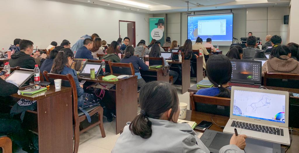 本次训练营培训时间达两天,管郁生教授循循善导,主要讲授了关于零基础美术学生的培养、数字绘画教学方法的创新、Wacom数位板在教学中的应用,参与此次训练营的教师大多来自重庆大学、四川美术学院、西南大学等重庆地区高职院校,旨在为教师们带来全新的教学理念和设备使用技巧。管教授授课风趣幽默,结合自己的教学经历,倾囊相授,各院校教师互动频繁,成果丰硕。