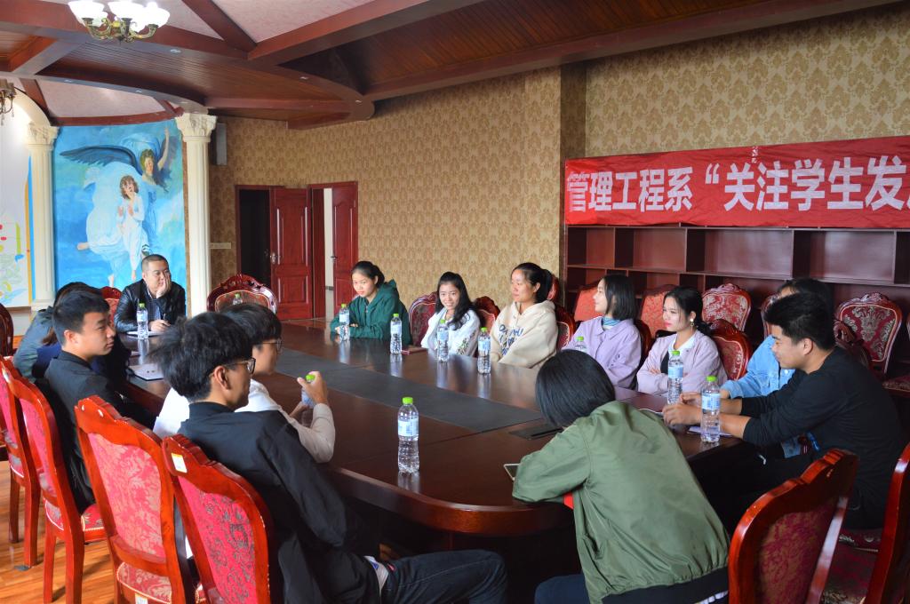 教育不在于使人知其所未知,而在于按其所未行而行。移通学院重视以人为本,以每个学生为本的人才培养模式,因此管理工程系于11月2日上午10时在第二实验楼英美村开展了管理工程系系主任接待日。管理工程系主任林毅博士,辅导员郭毛毛老师、蒋兵老师参加了本次会议。2018级管理工程系工程管理3班的学生代表与老师进行了面对面交流。