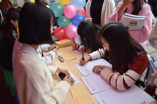10月15日中午12点整,第十二届寝室文化节“全寝fun开乐,健康青春行”在一二教广场正式拉开序幕。“阳光生活,Show出真我”在现场同时开展,以笔述情,用一封信为抒发自己的内心。给自己一封信,解心中迷惑;赠老友一封信,寄友谊长久;予爱人一封信,愿青鸟殷勤。现场围满了同学,积极热情的询问活动规则想要参与,还有为心中的种种挥笔疾书的同学们,现场同学表示用文字发泄内心的情绪能够有效是释放心中的压力,觉得这样的活动有利于身心健康。活动现场热烈的气氛吸引到我校外教过来观看并表示想要参与到其中,体验一下文字的魅力。
