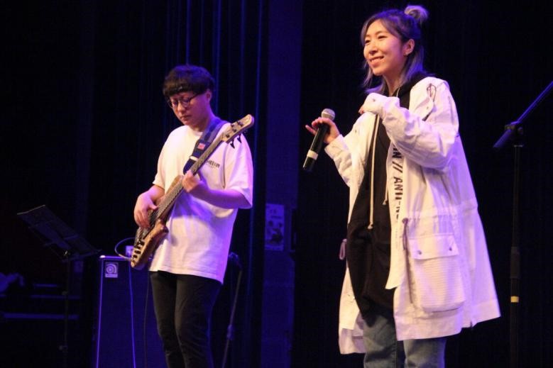 来自贵州的“重度”乐队今晚在Heaven舞台带来精彩表演。开场一段激情澎湃的摇滚乐曲,悠扬的歌声划过每位观众的心弦。同学们随着乐声挥手,翩然舞动。摇滚,是一种欢快富有节奏的乐曲。在铿锵的鼓声伴奏下,贝斯和吉他手全然沉浸于摇滚之中,伴着节奏舞动身体,释放心中最激情饱满的情感。