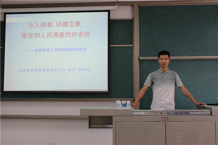 为进一步落实新形势下我校师德师风建设要求,提升我校思政课教师的师德素养,6月13日下午,思政教学部在1310教室举行了以“为人师表,以德立教,做党和人民满意的好老师”为主题的师德师风培训会。此次会议由德育教研室主任杨勇副教授做主题讲座,思政教学部全体教师参加。