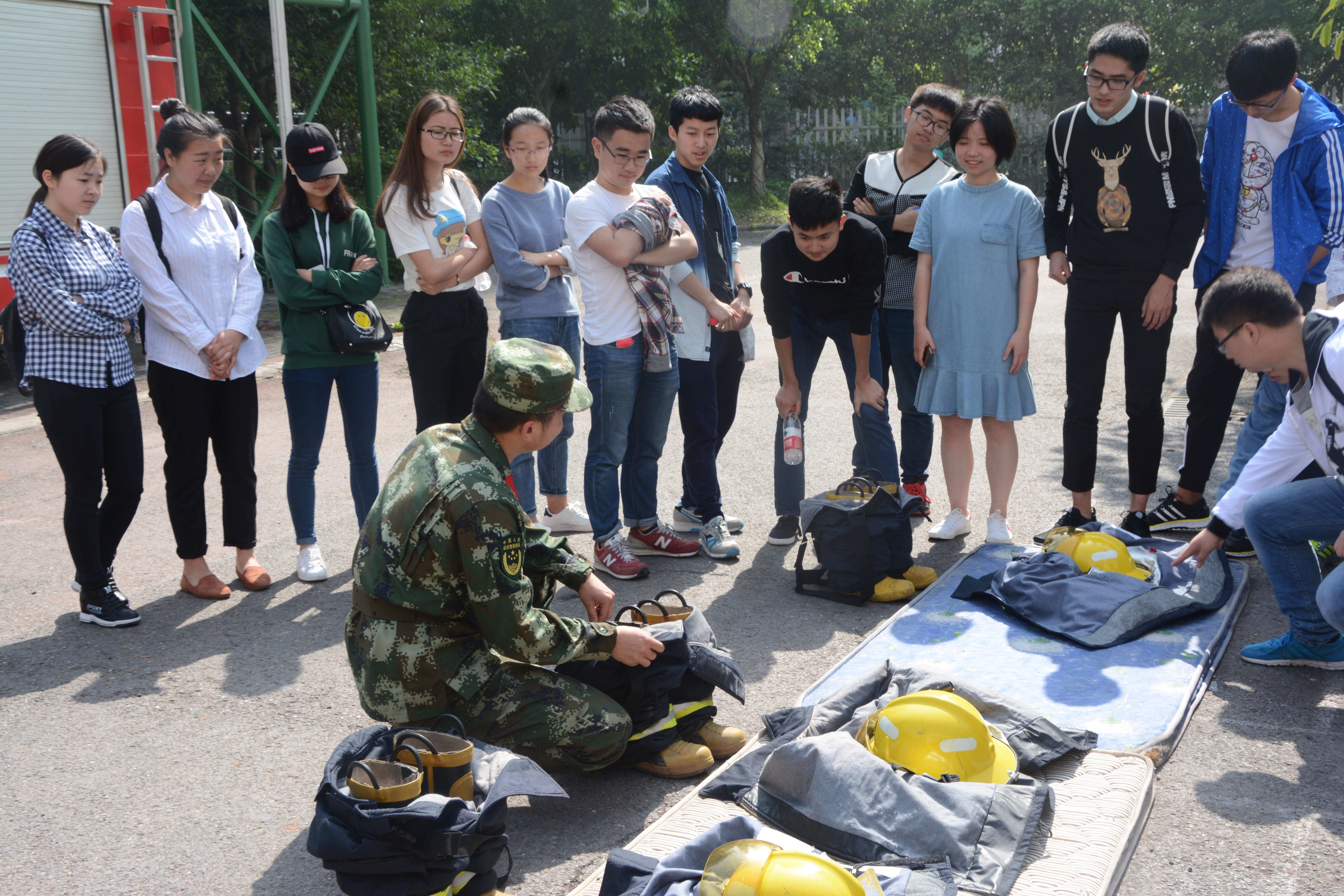 (消防员在给同学们讲解如何穿戴消防衣)