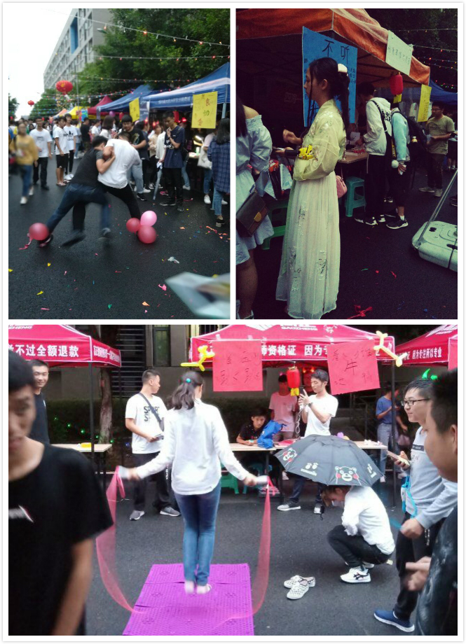 在皎皎月光影射,灯火通明的街道上 ,此时最美移通街不仅仅是移通的一条闪耀的街,更是合川高校的一条闪亮的街。在热闹非凡的街上,不仅有着许多的闯关小游戏:指压跳绳让人酸爽刺激,水枪大战让大家体验刺激战场……