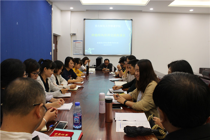 为进一步弘扬高尚师德,传承师德精神,深入推进师德师风建设和精神文明建设,9月26日17时,思政教学部在417会议室召开了以“师说师德师风”为主题的师德师风建设交流会,引领教师争做有理想信念、有道德情操、有扎实学识、有仁爱之心的新时代“四有”好老师。会议由思政教学部主任邓燕主持,思政教学部全体教师出席参加。