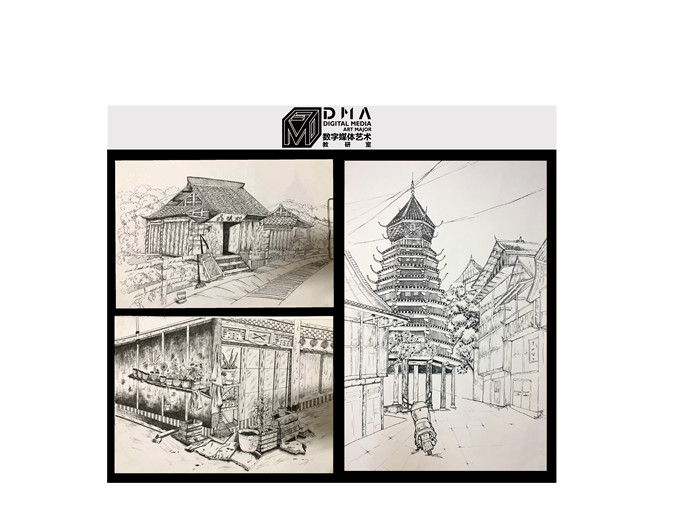 写生的第一天以风景速写为主,在教师廖国臣、李如冰、闫公博和郑宇的带领下,组织同学们根据自己的审美,选择角度比较好的景色开始速写,以此来激发同学们敏锐的观察能力和对环境的新鲜感受力。晚上回来后,所有同学将自己的作品聚集在一起,由带队老师对当天作业进行点评。