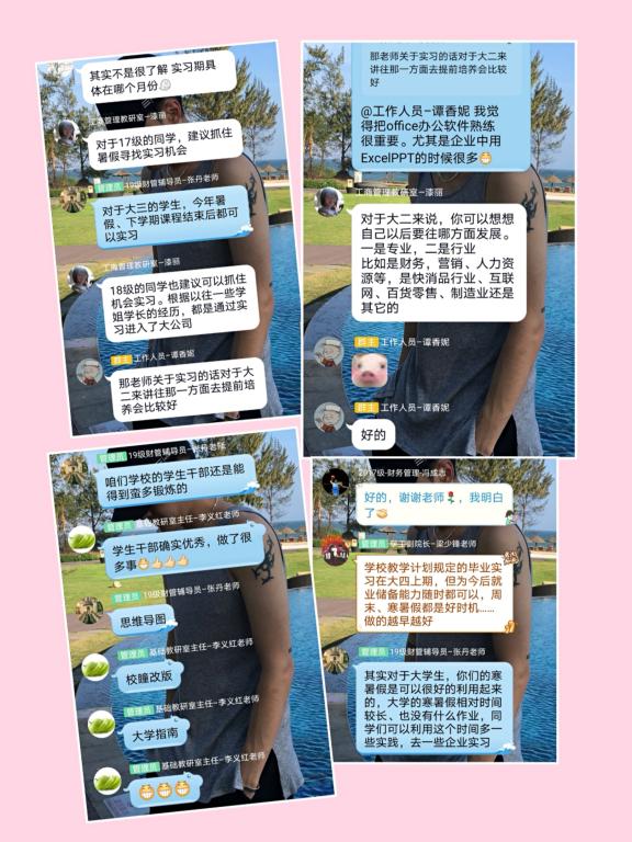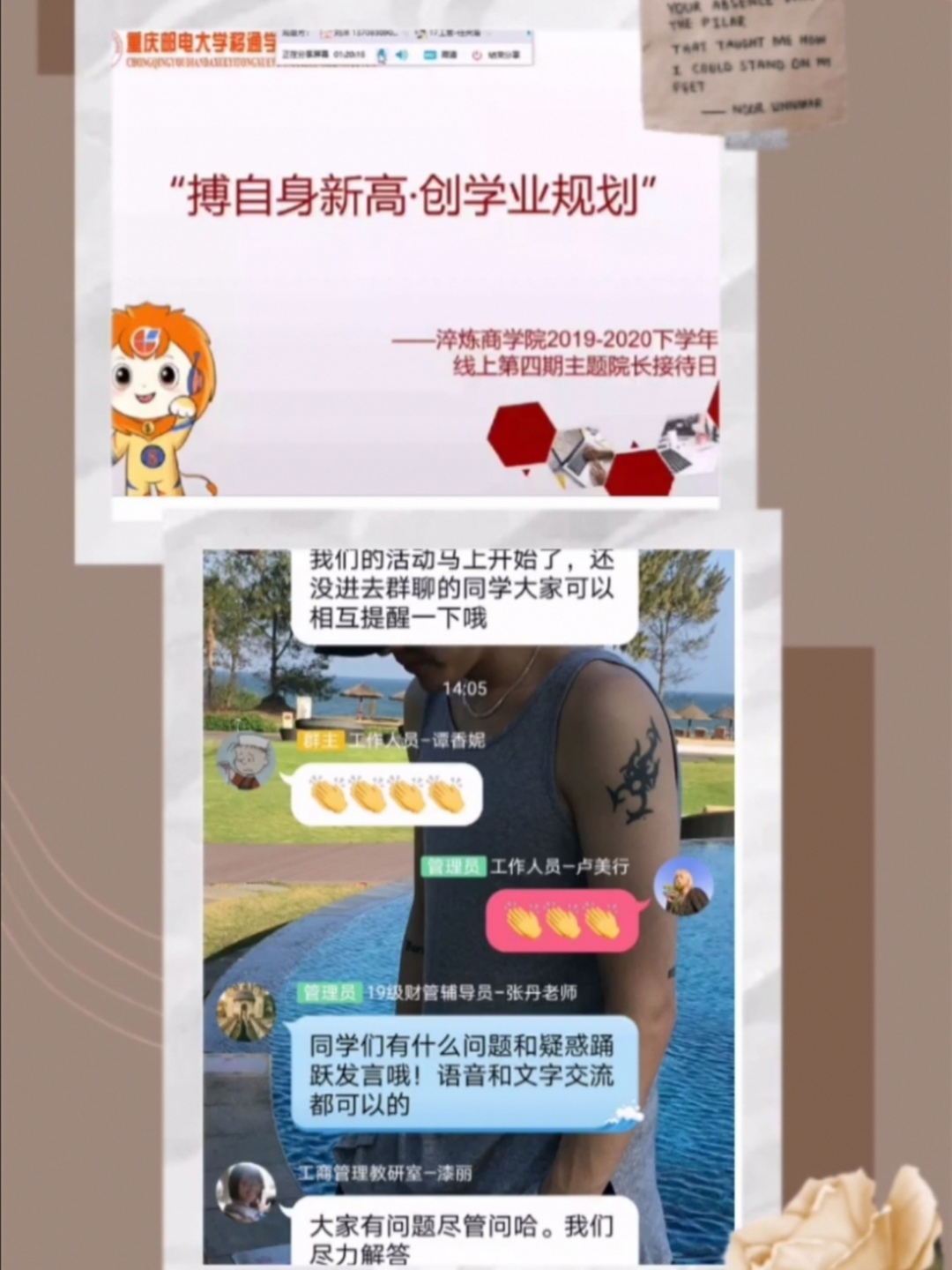 大三是整个大学生涯中一个转折点,前方可以道路重重,不少大三学子在这一阶段对于个人能力及即将面对的社会都充满着疑惑。为此,淬炼商学院就业助理团于2020年4月7日下午两点在线上举行了针对大三学生关于“搏自身新高·创学业规划”为主题的院长接待日。本次活动邀请到秦春蓉副院长、张平副院长、梁少锋副院长、基础教研室主任李义红老师、工商管理系教研室漆丽老师、领导力教研室的杨柳老师及活动指导老师张丹老师,活动期间大三学子与老师们就现存在的各种问题展开激烈的讨论。