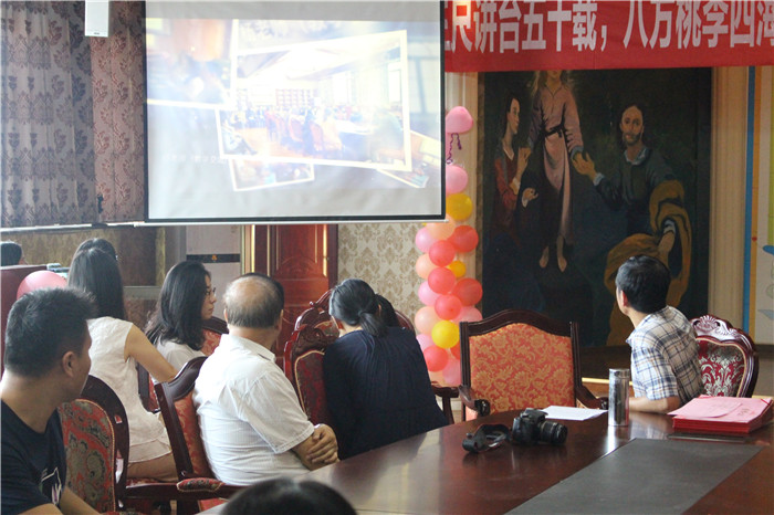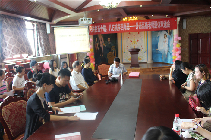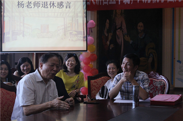 影毕,由吴世银主任致欢送词。吴主任代表老师们表达了对杨老师的感谢与祝福,感谢杨老师对建设外语系做出的不可磨灭的贡献,感谢杨老师曾给予年轻老师们的无私帮助和教诲,并诚挚地祝福他的退休生活丰富、幸福。杨老师非常开心激动,在即将告别讲台的此刻,他充满了不舍,但也记挂着再跟老师们说点什么。沉吟片刻,他饱含深情地向大家讲述了他这一生走过的教育职业轨迹。带着父亲奉献教学五十年的愿望,他从大学毕业后那个年代艰苦的劳改农场开始,接受贫下中农教育,到后来被分配到小学教书,精神苦闷中依然坚持学习,到文革结束后,终于有机会去到当时的泸县师范学校教英语,后来再去到现在已是国家重点中学的泸县二中一边教英语一边受文教局委托培养师资。在带领尖子班参加全国第一次高考取得不凡的成绩后不久,受邀去到泸州教育学院任教,再后来就是回到重庆,执教于重庆邮电大学以及到今天的移通学院。老师们凝神静听,仿佛穿过岁月,又再见到那个奔波在祖国英语教育第一线并为此奉献出自己青春和一生的高大身影。教室随时代变迁,而风雨五十年的讲台生涯,始终如一的是他对教学满怀的一腔热情和对学生强烈的责任感,学生们也深深爱戴着这位用心对待他们的老师,这从大家对他亲切的称呼“鼎爷”就看得出来。