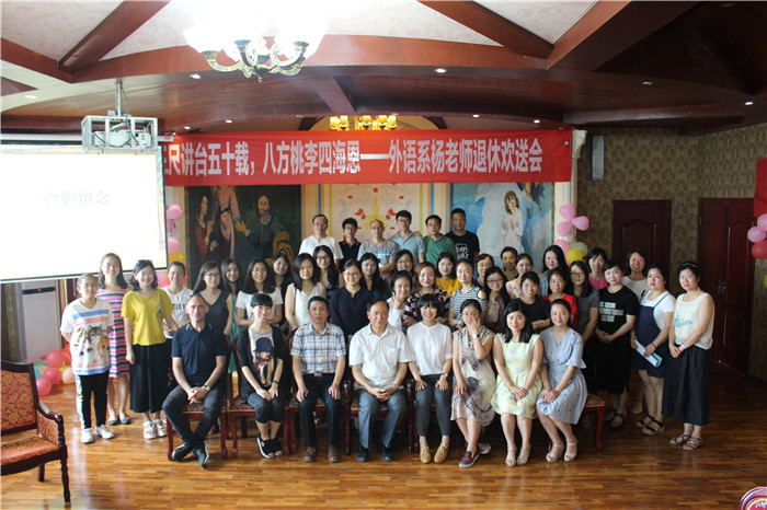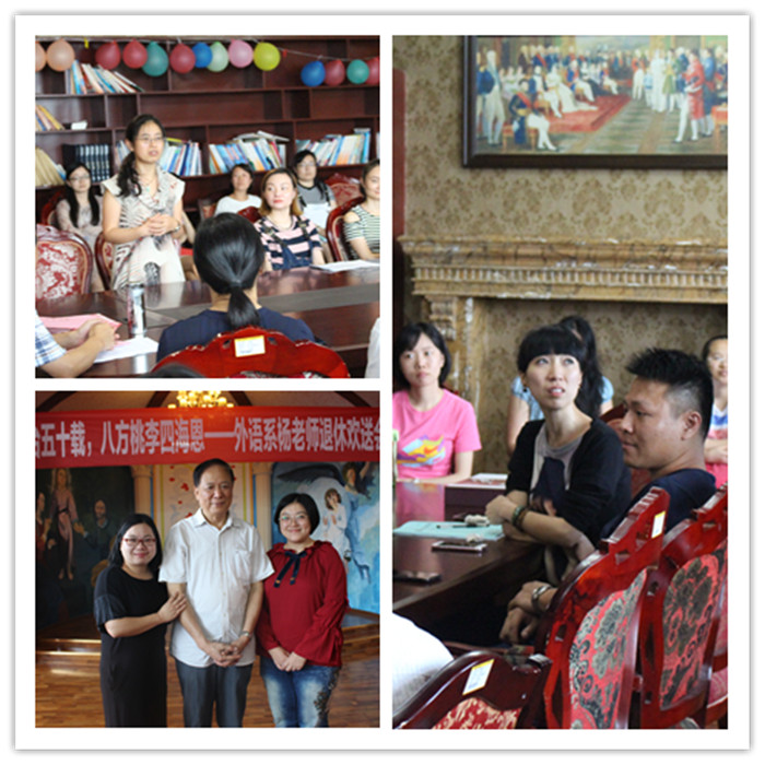 6月13日的英美村异常热闹和温馨,墙上挂着“三尺讲台五十载,八方桃李四海恩”、“欢迎杨老师常回家看看”字样的横幅和心形的彩色气球,还有布置得美美的爱心照片墙。仔细一看,每张照片都有一个共同的主角---外语系的杨祖鼎老师。今天是一个略带伤感又特别的日子,外语系全体老师在这里举行杨老师的退休欢送会暨教学比赛颁奖仪式。