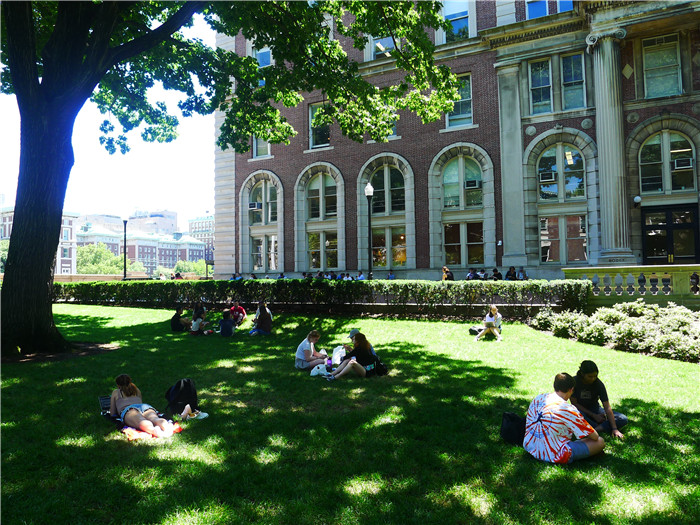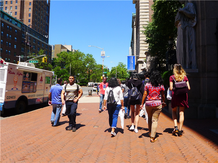 在哥大的草坪上你随处都可以看到躺着或者围坐的人,街上的公交站是透明的,纽约很多街道,地名都是用数字命名的。在来之前,老师就曾叮咛过要带好晾衣绳,没有晾晒衣服习惯的人们都是用的烘干机。还有很多流动的商铺。地铁上也不是每一段都有空调。