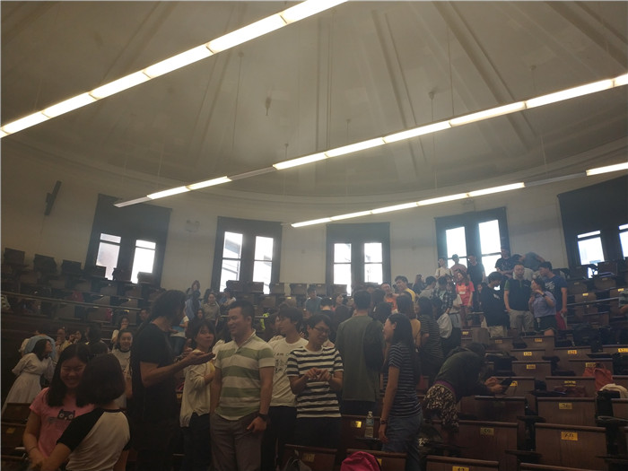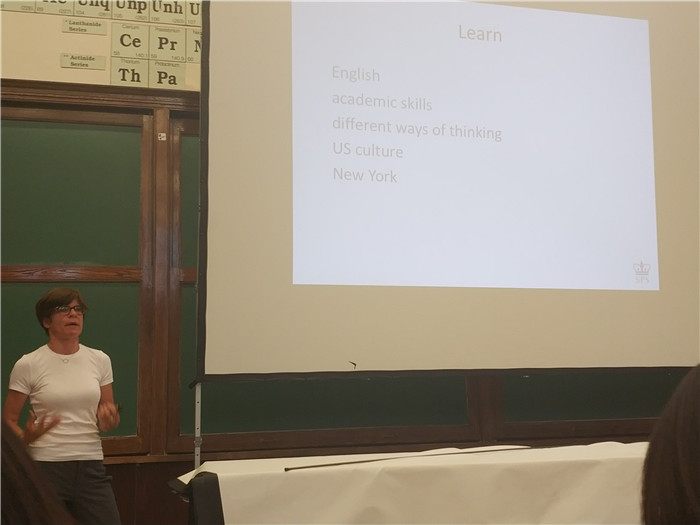办理完成后,我们在指示员的带领下来到309 Havemeyer,进行入学会议。这个能容纳下330人的教室可不简单,它曾作为很多电影的场景之一,例如《The first Three Spider-man films》、《Mona Lisa Smile》。Jana是ALP项目的Advisor,或许是照顾到面前的我们初来乍到,她的语调缓慢而清晰。“What are we doing here?”大厅里的各个国家的同学来到哥伦比亚大学都有自己想要做的事情,例如学习英语、体会美国文化、不同的思考方式等。老师向我们抛出很多问题,尤其区别了“I know the grammar”和“I can use the grammar”,在国内学习英语大多是死记硬背,没有学会将语法灵活运用,这也是阻挡英语水平进步的障碍之一。