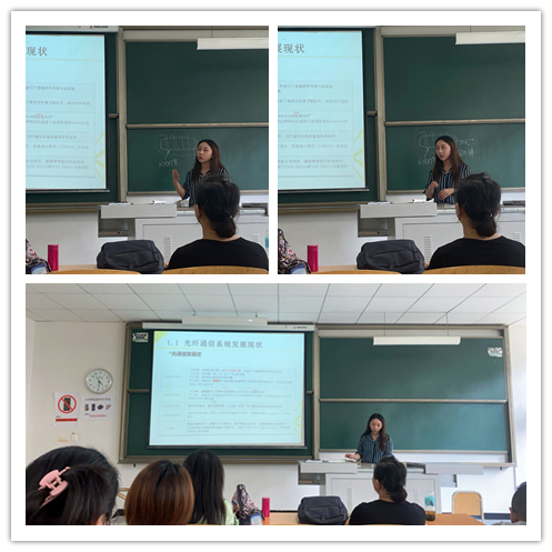 16:20试讲正式开始,本次试讲的教师是通信技术教研室新进教师刘玥岑,她2018年硕士毕业于重庆邮电大学,毕业后入职重庆信科设计有限公司,具有一定的工程项目经验。此次试讲,刘老师从自己即将教授的科目中选择《光纤通信原理与技术》课程作为试讲内容。