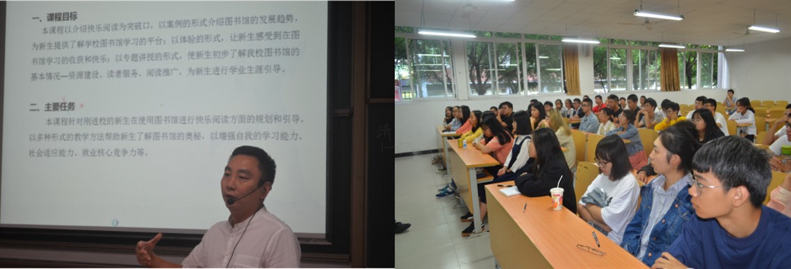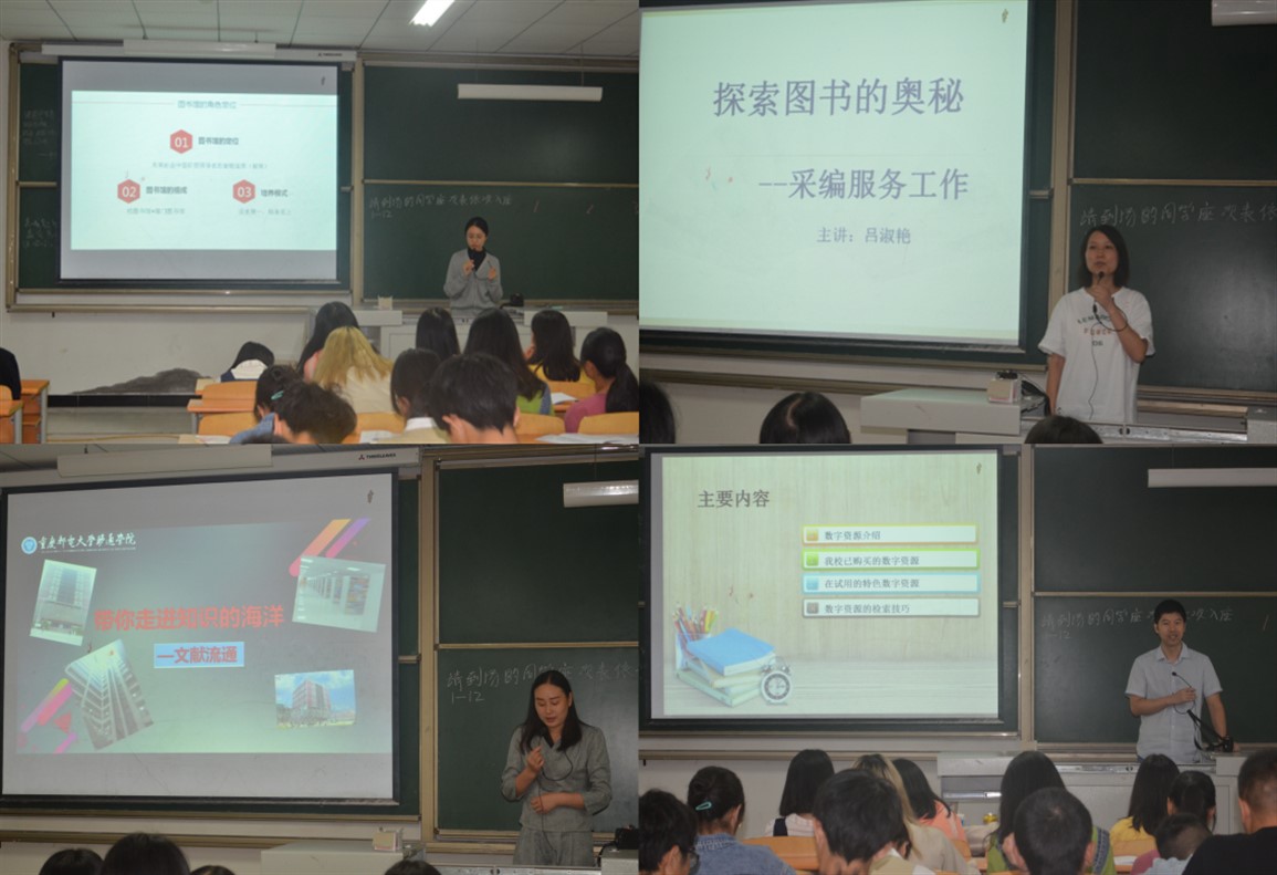 4105教室里,图书馆馆长秦代辉以及各部门老师以专题讲座形式带领新生走入我校图书馆的精神世界,探索“图书馆”的奥秘,讲述着大学生活与图书馆的不解情缘。