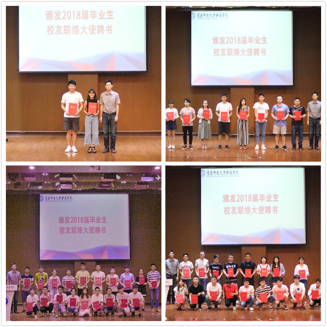 陈仲华老师宣读了《重庆邮电大学移通学院聘请2018届毕业生校友联络大使的名单》,经个人自荐和班级推荐、各学院审核、学校审定,共有142人受聘为我校2018届毕业生校友联络大使,校友会副会长、秘书长、院长助理周伟老师为校友联络大使颁发聘书。
