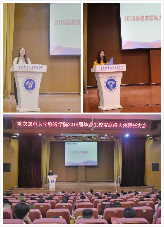 2018年6月23日下午14点30分,重庆邮电大学移通学院2018届毕业生校友联络大使聘任大会在下里巴人剧场顺利召开。校友会副会长、秘书长、院长助理周伟老师,校友会副秘书长、校友工作办公室主任陈仲华老师,双体系校友会会长、重庆校友会副会长、胡竟校友,各院系校友工作负责老师,2018届毕业生校友联络大使受聘学生等约180余人参加了大会。本次活动主要从介绍校友会及其工作开展情况、宣读校友联络大使名单及颁发证书、校友联络大使及校友会代表讲话、领导讲话等几个方面来展开。