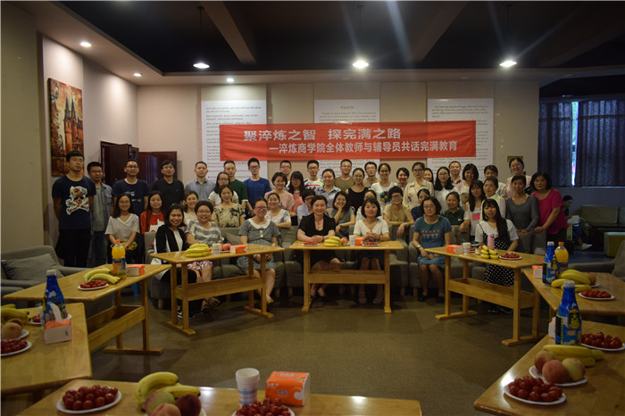 6月20日下午,淬炼商学院在我校咖啡厅召开“聚淬炼之智,探完满之路”交流座谈会。孙玺院长、学工办谢银平主任、全体教师与辅导员共计50人出席此次座谈会,结合专业教育,探讨完满教育。学工办主任谢银平老师和基础教研室主任秦春蓉老师共同主持此次座谈会。
