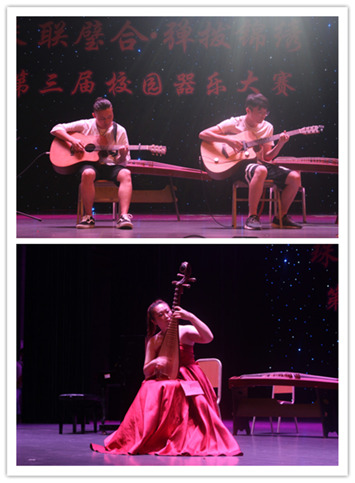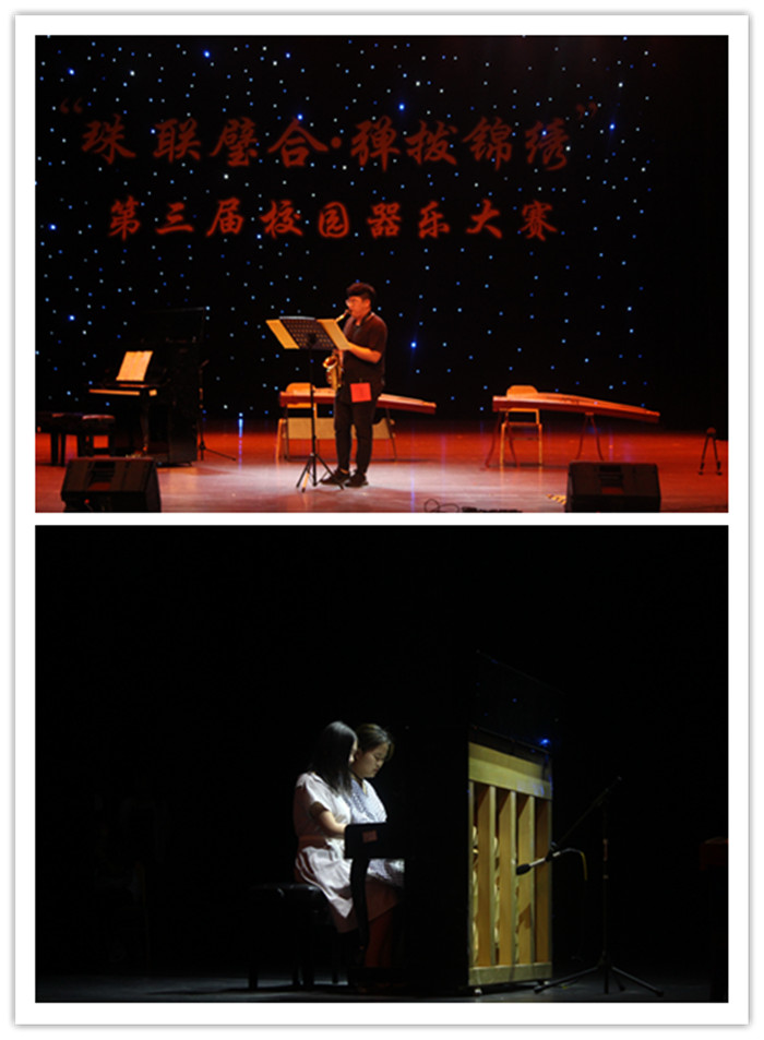 转轴拨弦三两声,未成曲调先有情,琵琶音如百雀欢歌,撩动人心。低眉信手续续弹,娴熟的指法让我们的目光落在弦上,贾戈辉同学为我们带来的《千章扫》清丽温婉,在光辉的岁月里不遗余力,耕耘不辍。古今音律,百般乐器,各自为妙。咽音奇,歌尽悲欢。是绝唱,三唱九叠,恸彻千年。冯俊铭、张慕容四手联弹《军队进行曲》,引领观众进入大赛高潮,乐曲既诙谐又有进行曲的气势,又如大江流水般奔流不息,无拘无束。选手们相继带来的古筝,笛子,吉他,琵琶,是一场古今的切磋,形散而神聚,是一场精彩绝伦的音乐碰撞。