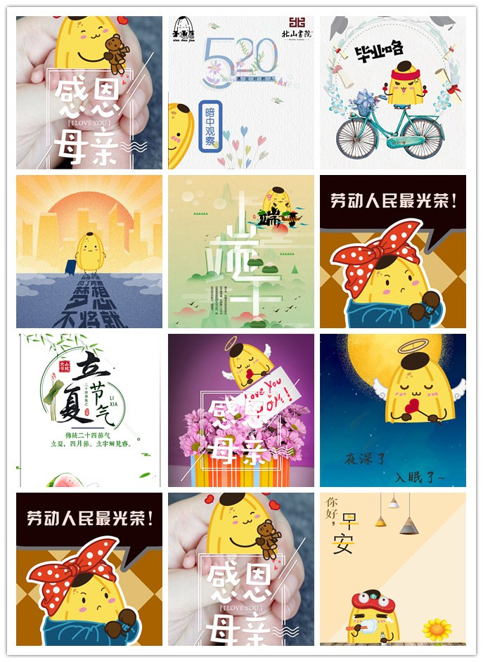为了使北山书院自媒体宣传更加生动,同时丰富北山文化形象,搭建北山新媒体平台,北山书院以其艺术形象“小山蕉”为原型,以每月新闻热点或节庆、节日为内容设计专属手机壁纸。同学们在设计壁纸的同时锻炼了5月共设计10张壁纸。我们的家——北山书院,有了最初的模样。希望小山蕉是你最熟悉的配方,最熟悉的味道,北山之家的一砖一瓦,夯实着你的青春之歌,勇敢的大学,自信的你,而北山为你坚持在这里,记住这里永远给你力量,我们的四次元口袋永远为你敞开。