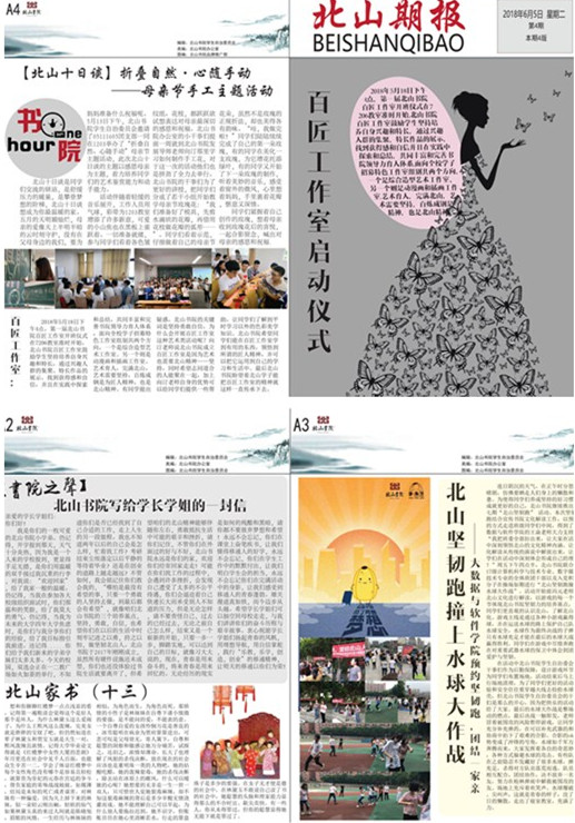 为更好的宣传了北山书院的各项活动,让北山发出更广博的声音,让学生更容易读懂北山,每月编辑《北山期报》。截至5月底已出品4期。在5月期报中凝练了“北山坚韧跑”“百匠工作室”“北山十日谈”“北山家书”“北山书院写给学长学姐的一封信”等板块,让大家能从汇总的内容中更清晰直观的看到北山5月的精彩。