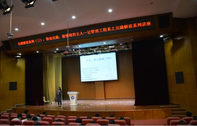 为了更好帮助大一新生解决有关心理健康的问题,学会管理自己的情绪,以更好地面对大学生活。因此,2016年10月8日19:00重庆邮电大学移通学院管理工程系2016级全体学生在下里巴人举行了以“律动完满,做情绪的主人”为主题的完满解读年级会,本次年级会由辅导员吴平老师主持,主讲嘉宾为心理健康服务中心樊春燕老师。