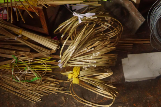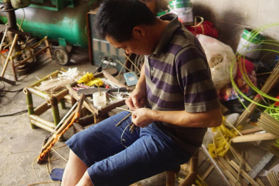 图为制龙师傅利用竹子和纯手工制作龙骨和龙头,选择竹子是因为竹子重量轻且有韧性,这道工序要求制作者懂得捆扎技巧同时手上又有一定的力道