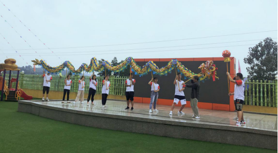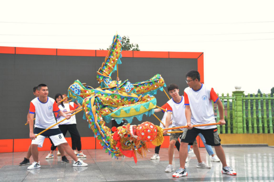 图为队员们在李诗敏老师的指导下摆出了经典的“之”字龙的造型,同学们在联系中感受到了舞龙带来的乐趣和对团队配合的考验