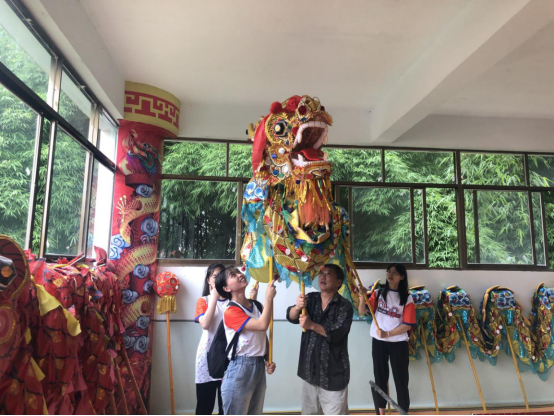 来到高楼镇村镇上,队员们聚集在高楼小学的门口走访镇上的火龙文化馆。眼见为实,亲身感受才能真正体会到文化的魅力。在调研采访文化传承人李诗敏老师的过程中,团队青年了解到了铜梁火龙文化已在国际享誉盛名,为了更具观赏性,在演出的技术和工具上进行了改进,传统的手动鼓风被鼓风机所代替,用精铁块代替粗铁等。李老师从小跟随父亲学习舞龙,直到他六十多岁的年纪还在为火龙文化的推广坚守着贡献自己的力量,李老师伤疤累累的双手昭示着手艺人传承的决心。采访结束之后李诗敏老师指导队员们“小试身手”尝试了“铜梁火龙”的舞龙技艺,在其中领略了魅力所在。