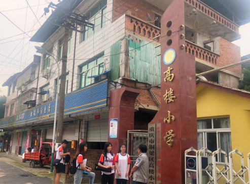 图为团队成员在高楼镇小学门口对当地居民进行关于铜梁龙文化的调研了解其对本地人带来的影响