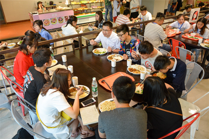 座谈会后,师生们相约A食堂一楼的餐饮区继续交流用餐,共叙情谊,共话未来。大家像朋友一样坐在一起,畅聊生活中的开心与不开心。郑先锋院长向大家介绍了一些关于学校各种资源的福利,讲起关于他年轻时候的故事,除此之外,还热心的向同学们推荐重庆的一些看书胜地,并鼓励同学们在大学期间保持良好的生活习惯,找到学习目标。