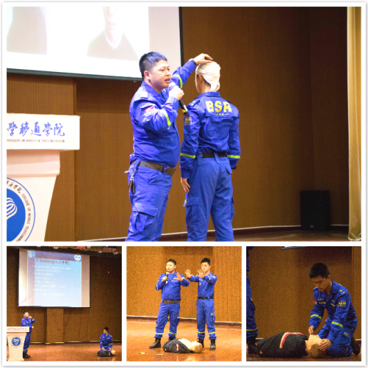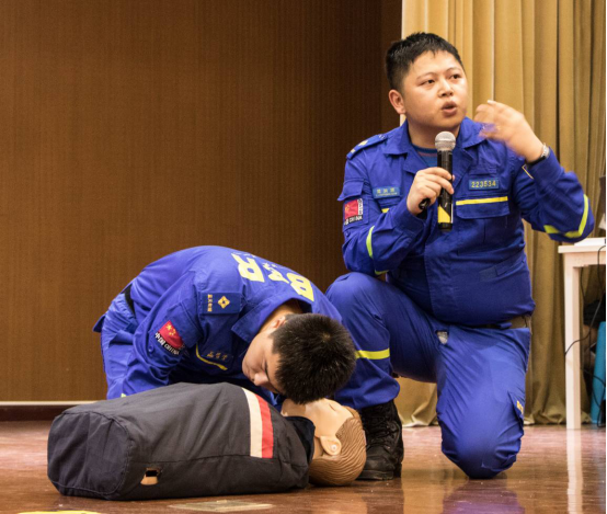 重庆市合川区蓝天救援队医疗组组长梁洪源为我们讲解心肺复苏和止血包扎,浅薄的急救认知可能会让大家认为心肺复苏只是在胸口压几下,人工呼吸也只是嘴对嘴吹气,但其实这样的想法是不全面的。心肺复苏要注意的要点很多:如果遇到一人突然倒下,要拍摇患者并询问确定意识,手指掐压人中穴约五秒,如无反应表示意识丧失,需要做心肺复苏。此时表明自己会做并询问在场是否有人会,协助自己救人。然后让患者水平仰卧,解开颈部钮扣,注意清除口腔异物,使患者仰头抬颏,用耳贴近口鼻,如未感到有气流或胸部无起伏,则表示已无呼吸。如果没按照要求乱做心肺复苏和人工呼吸反而会弄巧成拙,使患者情况更加危急……后来老师又为大家讲解止血包扎要注意的小要点,在为人包扎时要进行消毒和带手套,帮助他人的同时也要为自己的身体健康安全着想。