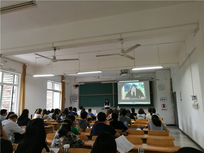 课堂由胡雨老师提出的一个问题Was ist Literatur?(什么是文学?)展开,引起同学们对此课程学习目标和意义的思考。接着胡老师结合图片向大家展示了一些德语文学中常见的体裁和代表作,如寓言、十四行诗及德国著名的格林童话,并以启发式的提问让同学们自己总结童话的特点。随后,胡老师播放了电影《白雪公主》的片段,要求大家观看后根据影片内容为角色现场配音,并走到同学们中协助他们。大家的兴趣高涨,非常踊跃,精彩的配音表演中欢呼声此起彼伏,为此堂课画下圆满的句号。