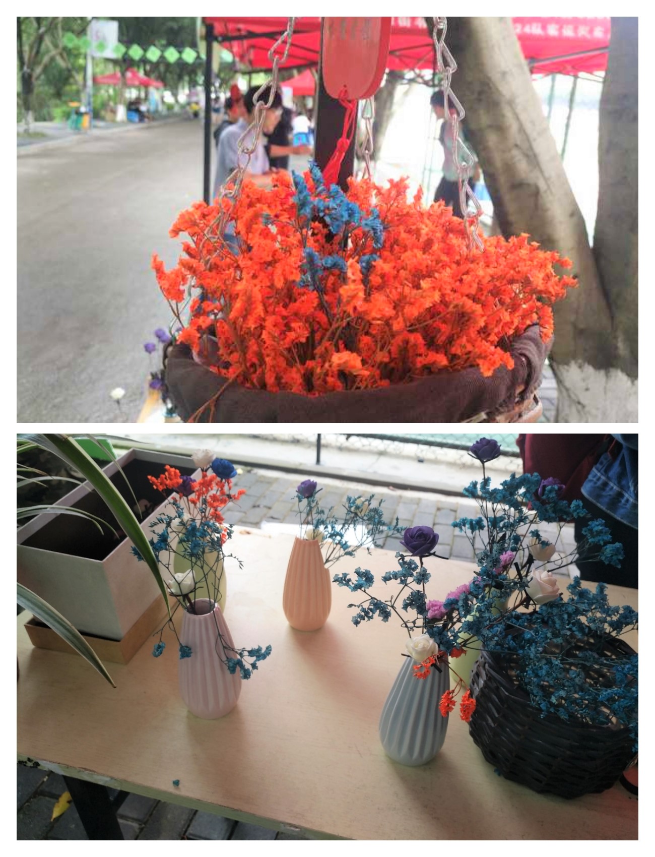踏着轻快的脚步,一路走走停停看看。校园道上的同学们不时的被那一道道美丽的风景所吸引,他们情不自禁的会停下脚步观赏那抹芬芳。对于不认识的花卉他们还会询问社员们,甚至路过的同学都会忍不住夸一句:“真漂亮!”本次花卉文化展区共计展出物品300余件,其中包括雏菊、马蹄莲、绣球花、百合、金边吊兰、多肉植物等花卉,以及干花和手工花、插花花瓶等其他展品,种类繁多。