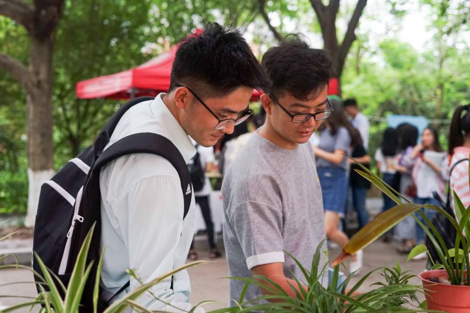 花卉专场“慧眼识花”活动同样吸引了很多同学的参与。不同品种的花整齐的摆放在桌子与花架上,在细雨朦胧中展现着别样的美丽。同学们依据植物的叶片、花朵、植株大小与形态等特征判断花卉名称并告诉工作人员,对于不正确的答案工作人员会加以指出并改正。“传播花卉知识,丰富校园文化”,花卉协会一直在行动着。