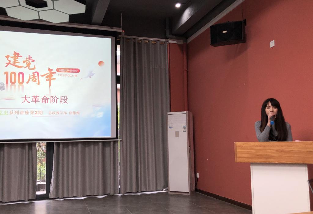 “中国共产党建党100周年,历经风霜,我们可以将这百年进程分成10个主要阶段,更方便和深入了解党的光辉历史,今天我们就共同探讨交流举步维艰的‘大革命阶段’。”唐老师在分享开始,便为同学们梳理了易学易懂的思路和提纲。大革命时期的那段历史,用一堂课的时间,也不能详尽其述,唐老师同样根据重要时间节点,将其分为几个阶段,以典型事迹、人物、影片等让同学们理解和内化。现场同学聚精会神,一边听唐老师讲授一边认真地做着笔记。国民党一大、黄埔军校建立、北伐战争、国民党右派叛变革命这些大家耳熟能详的史实,不同的时代、不同的环境、不同的心境、不同的讲述模式,每每讲起,都会给人不一样的收获。总结历史经验、认识历史规律、把握历史方向,对我们的学习、生活和工作,都具有与时俱进的价值和指导意义。