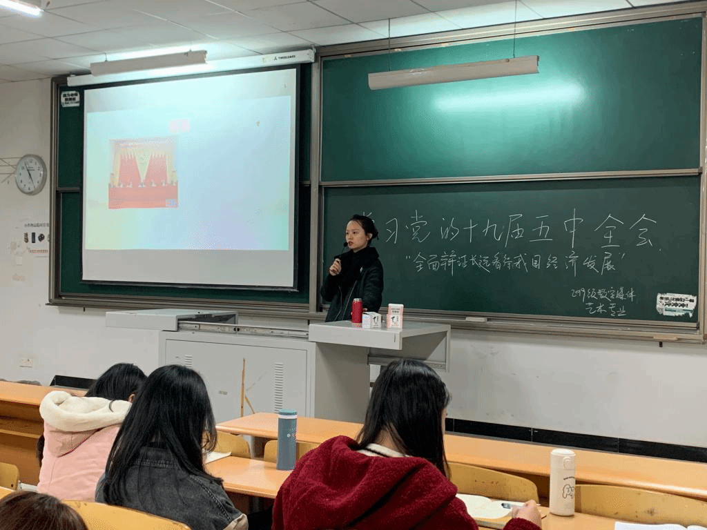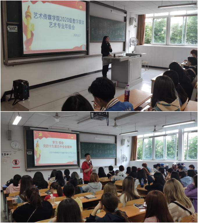 2020年11月17日中午12时,2020级数字媒体艺术专业在4202教室开展“学习领会党的十九届五中全会精神”主题年级会活动,引导、教育青年学生学十九届五中全会精神,了解国家发展新方向,树立与这个时代主题同心同向的理想信念。艺术传媒学院副院长李克伟,辅导员许静、卢伯年,及2020级数字媒体艺术专业全体学生共同参与本次主题学习活动。