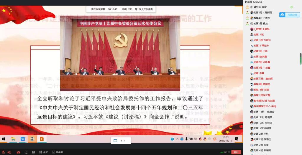 百年交汇,谋篇布局。11月19日,李欢老师组织2018级动画、数字媒体艺术全体学生在专业群开展了线上主题年级会。会上围绕十九届五中全会展开学习与交流。在当今世界正经历百年未有之大变局,我国正处于“两个一百年”奋斗目标的历史交汇点上,十九届五中全会是我党召开的一次重要会议。李欢老师从全面建成小康社会取得的决定性成就,如期打赢脱贫攻坚战,我国发展环境面临的深刻复杂变化,到二〇三五年基本实现社会主义现代化远景目标等方面针对公报内容进行讲解。