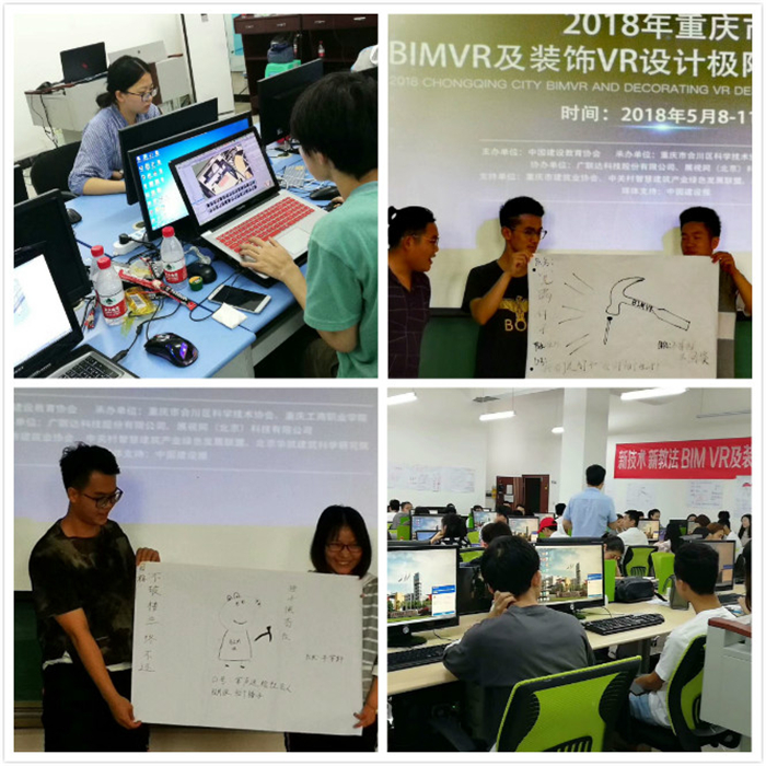 本次比赛从5月8号到5月12历时5天,包括赛前培训、正式比赛、教学研讨等多个版块,来自重庆的13所高校,共30支队伍参加了此次比赛。通过两天的培训后,参赛队伍围绕室外场地布置、建筑相关专业的VR表现及施工工艺动画等相关内容进行比拼,共同决出此次比赛的团队特等奖、一等奖等奖项。在赛前培训阶段,我校带队老师陪同参赛学生共同学习,并同时给予学生指导。在学习期间,四个参赛队伍的学生积极探讨、互相帮助,为后来获得较好成绩打下了坚实的基础。