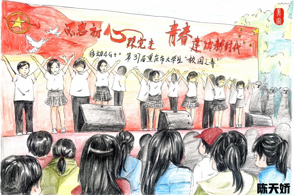 彩旗飞扬,每一面旗帜都代表着一所重庆的高校,因为“校园之春”我们相聚在移通。我始终记得喷绘上的“不忘初心跟党走,青春建功新时代”,校园是青春绽放的舞台,是青年奋斗的战场,我们要高扬理想信念旗帜,勇做新思想的践行者;志存高远脚踏实地,勇做新使命的担当者。在实现中国梦的生动实践中放飞青春梦想,在为人民利益的不懈奋斗中书写人生华章!