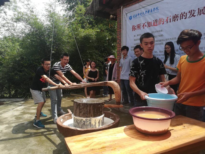 当然,打糍粑的同学也不甘落后,他们将已经蒸熟的糯米倒入石窝中,拿起木棍,围着石窝子在里面用力敲击起来,这个累了,下一个顶替,大家挥洒着劳动汗水,通过自己的努力制作美食。咦,那边的同学围着在做什么呢?走近一看才知道是在磨豆花,别看同学们第一次磨豆花,那磨起来可是有模有样,将提前泡好的黄豆放入石磨中,一起推着石磨,额头上滴着大颗大颗的汗珠,推石磨,不仅需要足够的力气,更需要掌握技巧,这样才能够事半功倍,同学们的脸上挂着最真实的笑容,看着豆浆一点点地被磨出,内心的喜悦是无法隐藏的。