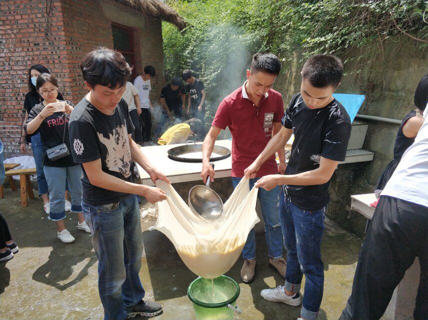 (同学们在一起体验石磨豆花、人工过滤豆浆、烧制豆花的过程)