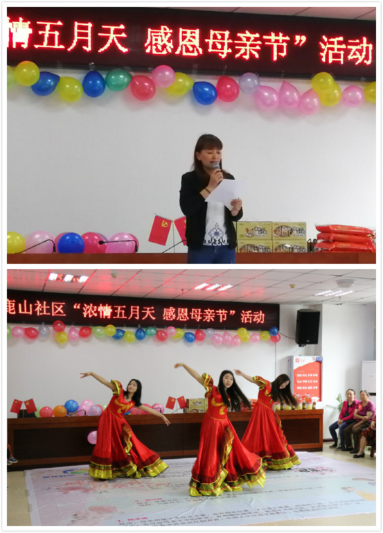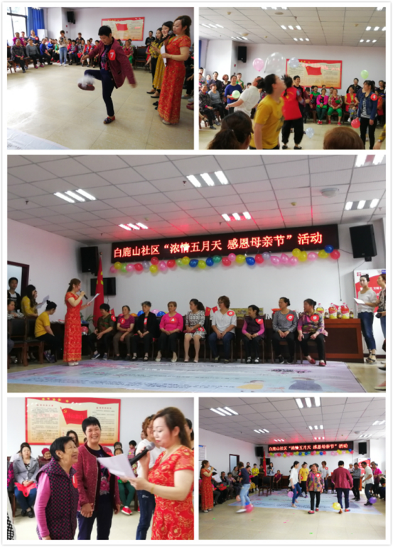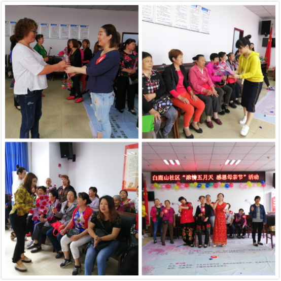 社区王书记讲到,“中国梦就是大家的梦,小家幸福就是国家的和谐。在街道办事处各级领导的关怀下,在白鹿山社区与和通信学院志愿者、合家志愿者的共同努力下,为了在社区内营造尊重母亲、感恩母亲的良好氛围,增强居民感恩意识、孝敬之心和社会责任感,传播志愿者精神,到达“家在社区,和合白鹿”的目标,举办了本次活动,现在我宣布母亲节活动正式开始!”