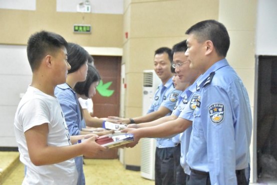 (禁毒所的警官在给同学们发放禁毒宣传手册)